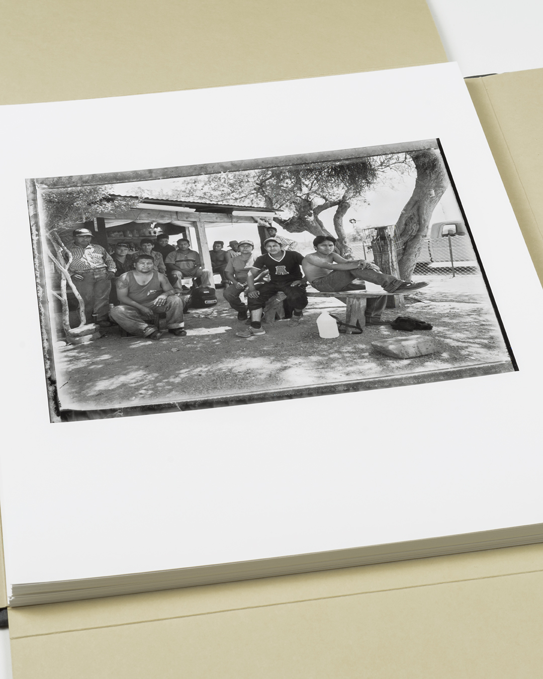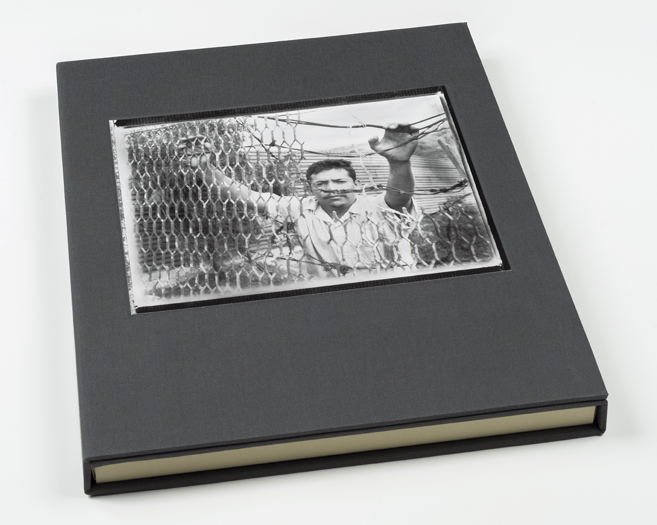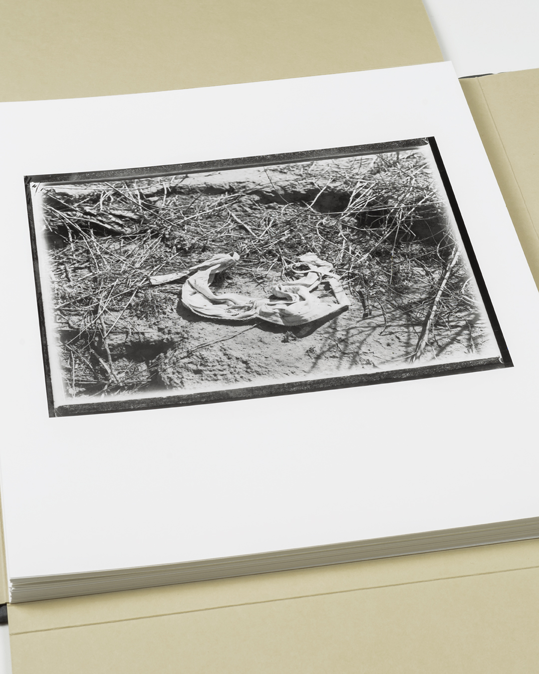 Bookcloth covered binders board with tipped-in photographs and archival folder
