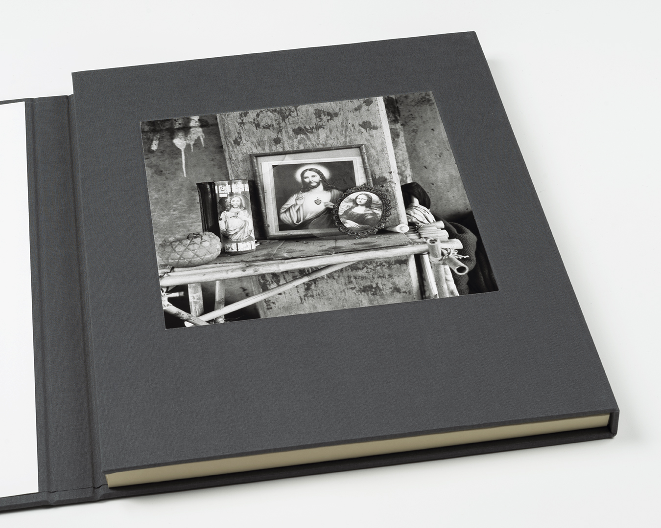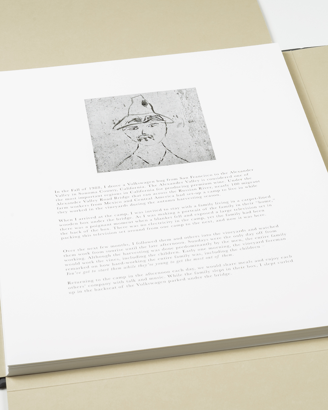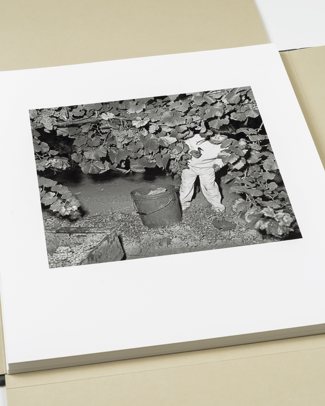 Bookcloth covered binders board with tipped-in photographs and archival folder